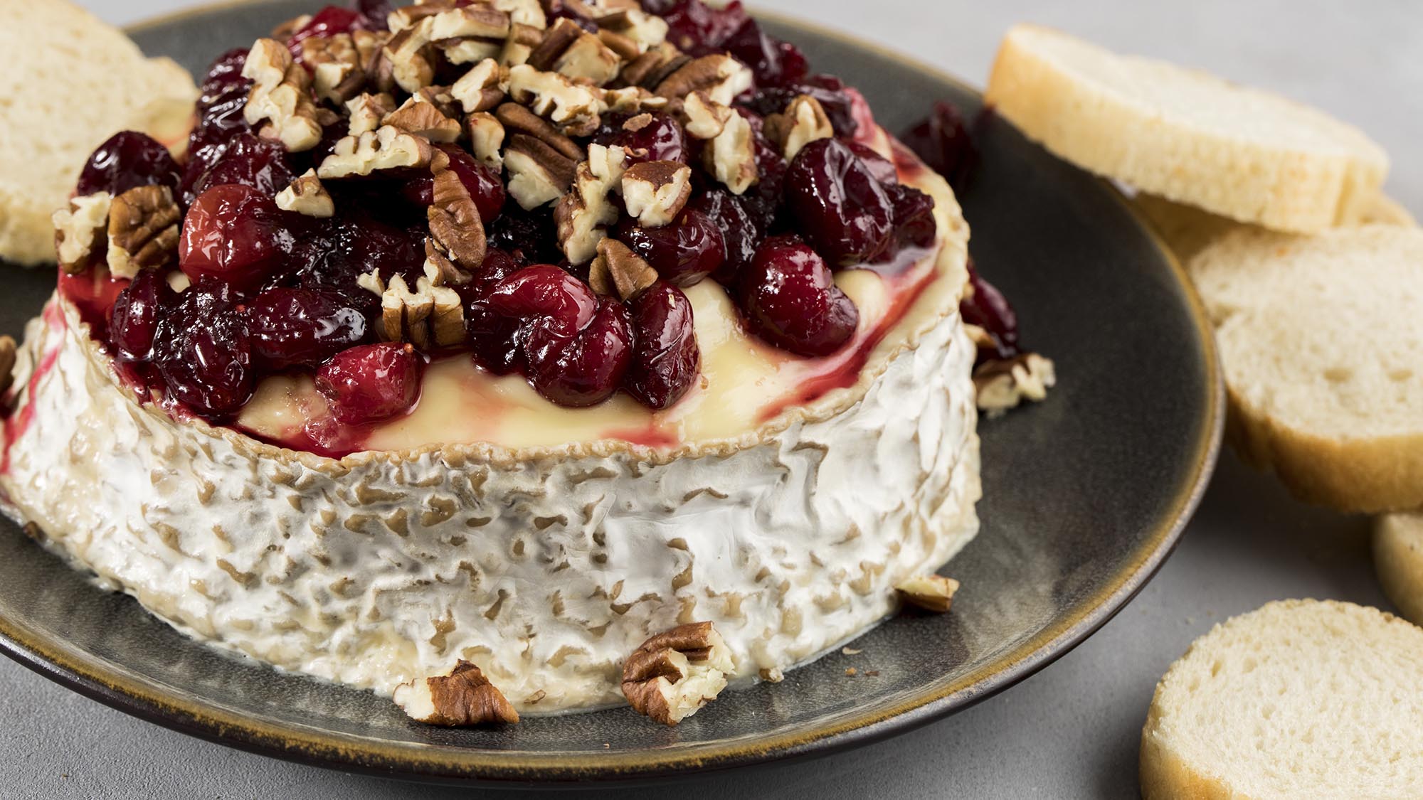 Cheese plate assortment of french cheese served with honey, walnuts, bread and grapes on ceramic.