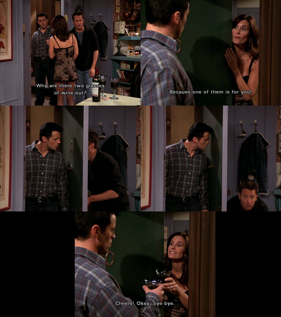 Monica is an autochthonous variety from the island of sardinia, off the west coast of italy and it is it doesn't matter if the glass is half empty or half full. So we can be friends who sleep together. Do you realize this is probably the last time we'll all be here in the coffee house as six single people? (clinking a wine glass) can i have everyone's attention please?
