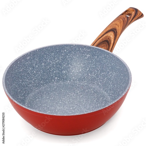 Traditional chinese dish cooked in a wok pan over an open fire. Empty old rusty rustic burnt frying chinese wok. Wok with wooden spatula isolated on white background. Most woks don't have lids, but this one comes with a unique wooden lid that keeps food warm until ready to serve.